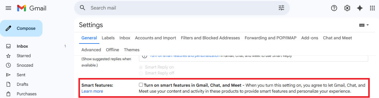 Conectando os pontos: usuários do Gmail que se preocupam com a forma como o Google lida com seus dados devem procurar as opções para recursos inteligentes no menu de configurações. As letras miúdas indicam que a funcionalidade de IA, que inclui diversos recursos, destina-se principalmente à personalização da experiência do usuário. No entanto, alguns ainda desconfiam, considerando os esforços do Google para integrar o Gemini em todos os seus produtos.